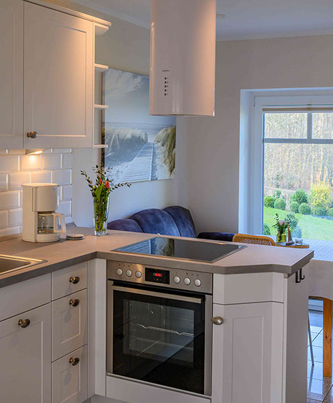 4-Zonen Cerankochfeld, Backofen, Brotmaschine, Mikrowelle, Dunstabzugshaube, Einbauküche, Gefrierfach, Kaffeemaschine, Kühlschrank, Stabmixer, Waffeleisen, Staubsauger, Toaster, Wasserkocher